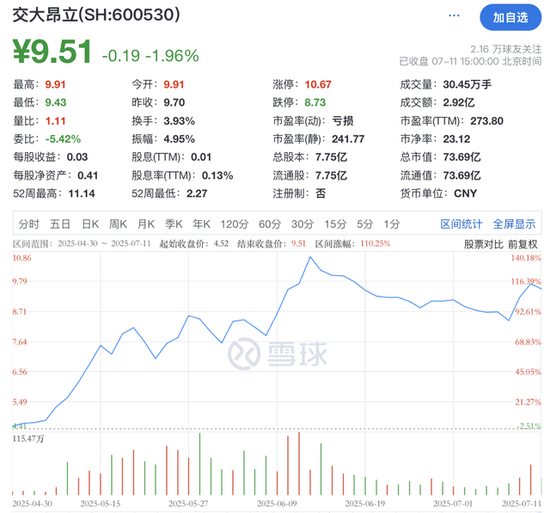 从股价表现来看,自4月29日公布业绩情况后,交大昂立股价呈震荡上行态势,从4.52元/股一路攀升,至7月11日已涨至9.51元/股,实现翻倍增长。