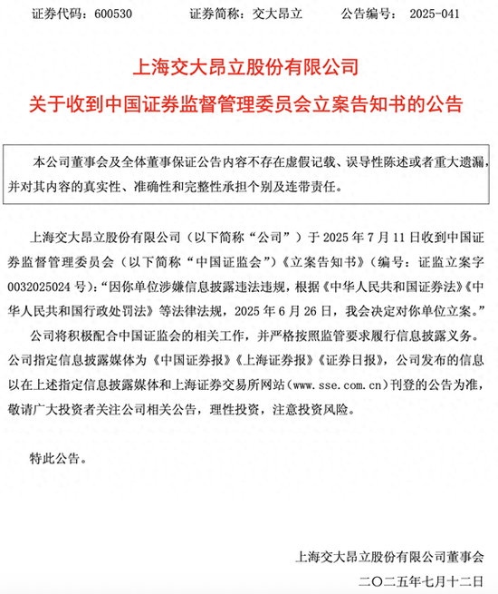 7月11日晚,交大昂立(维权)(600530)公告称,公司于当日收到中国证监会《立案告知书》: